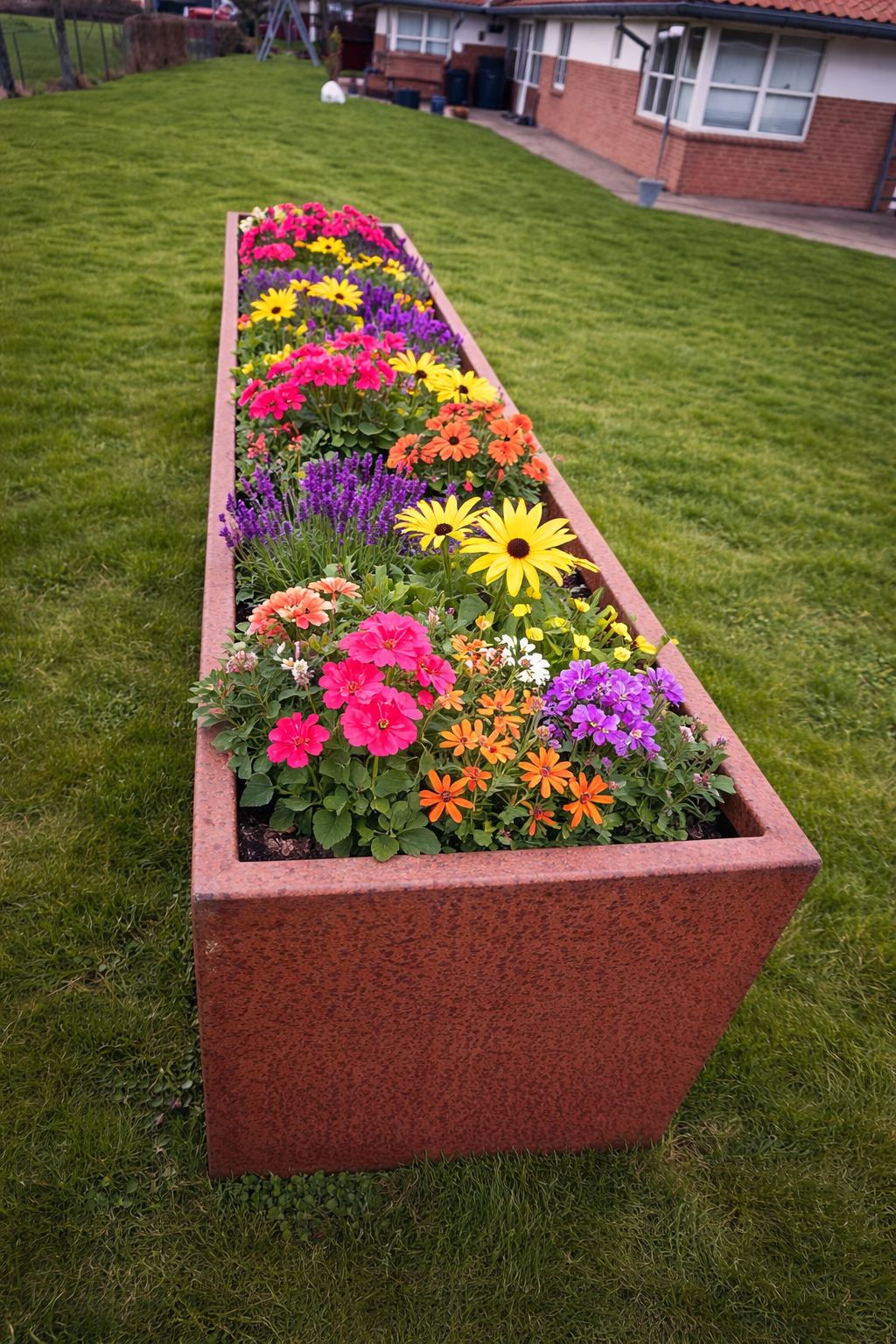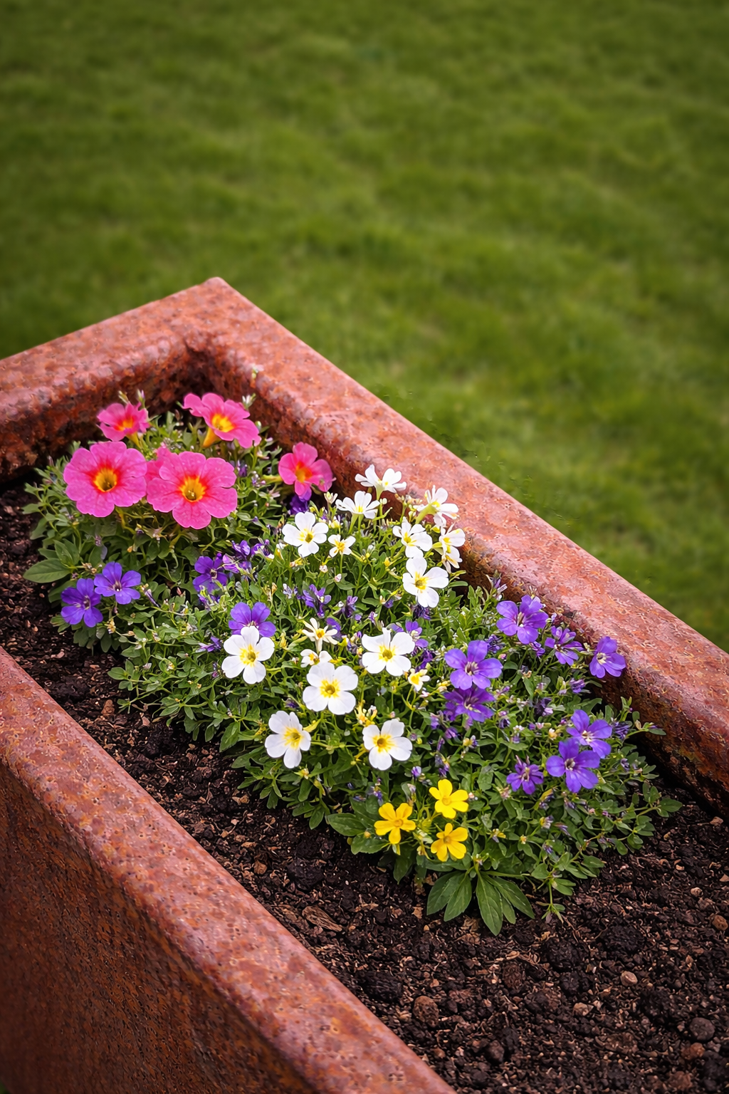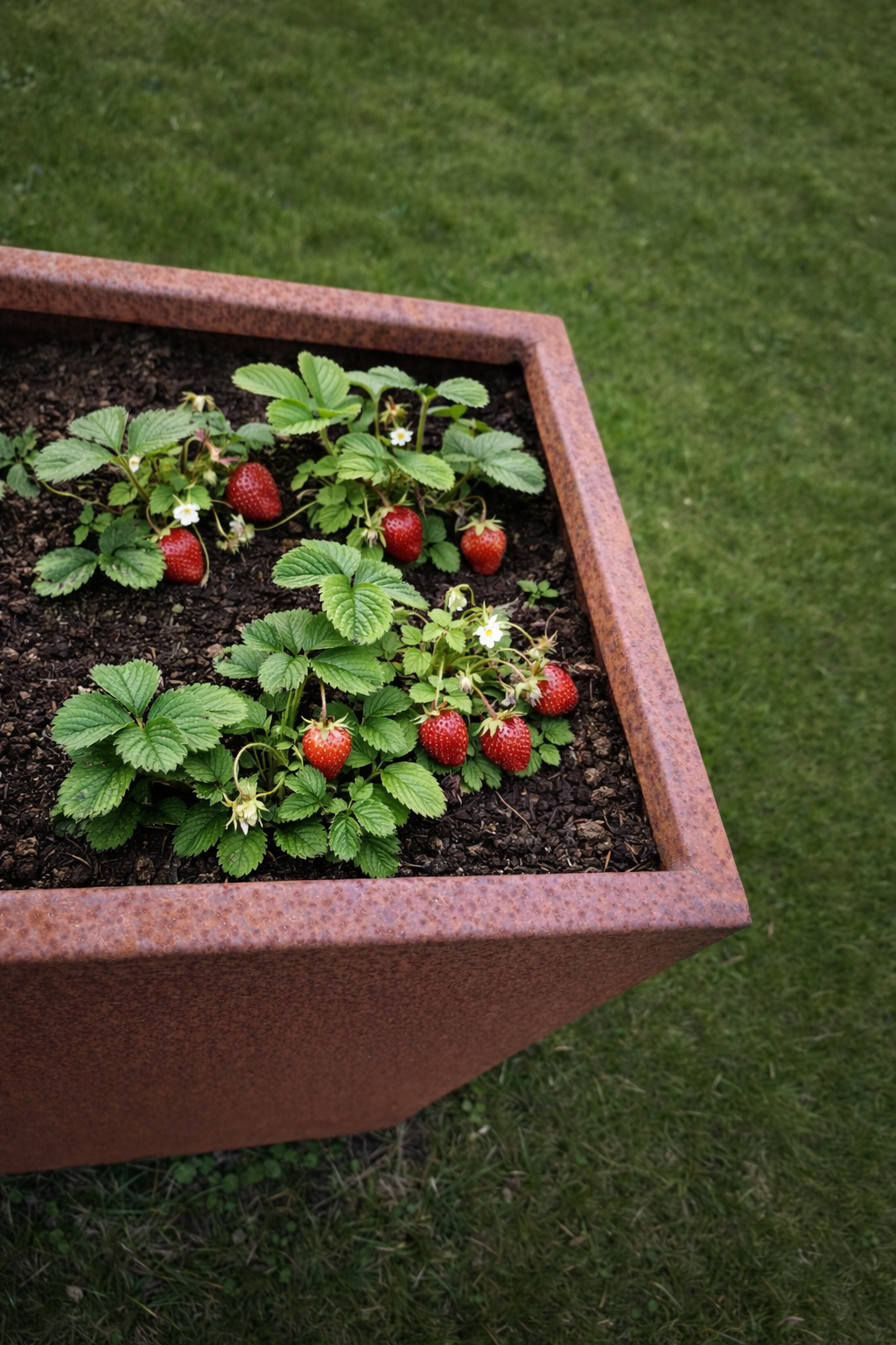 Blomsterkasserne fremstilles typisk i 3 mm cortenstål, som over tid danner en naturlig og beskyttende rustoverflade. Det giver et råt, eksklusivt udtryk og en løsning, der holder i mange år – uden behov for vedligeholdelse.